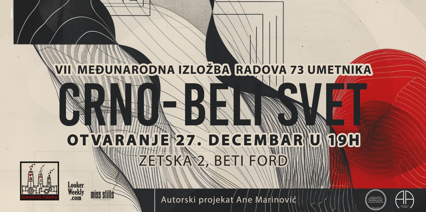U subotu, 27. decembra 2025. godine, u 19 časova, u Galeriji „Beti Ford“ biće svečano otvorena VII Međunarodna izložba „Crno-beli svet“, autorski projekat Ane Marinović, MA primenjenih umetnosti, u organizaciji Udruženja Kreativna fabrika.